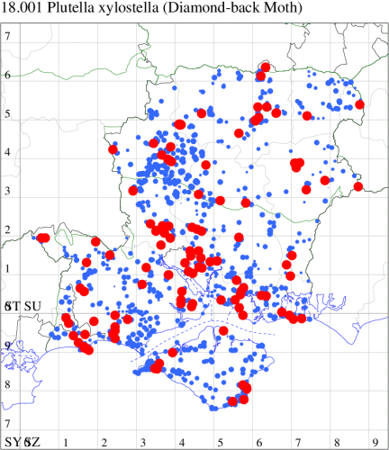 Common wherever the foodplant occurs, throughout the British Isles. In Hampshire the foodplant is local and so is the moth; there are only a very few records from the Isle of Wight. Wingspan 14-17 mm. Similar to Diamond-back Moth P. xylostella but slightly larger and more striated, and with three darkish rings on tip of antennae (MBGBI Vol 3). Larva feeds on Dame's-violet, beneath a silken web, often several together.