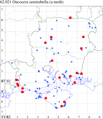 VC11: Brockwood, one, 26 Aug; one, 04 Sep; one, 09 Sep (SDut); Allbrook, one, 10 Aug; one, 11 Aug (SIng); Titchfield Common, one, 14 Aug (AShe); Portsdown, one, field obs., 20 Jul (DPH); Portsmouth, one, 01 Sep (IRT); Waterlooville, one, 26 Aug; one, 08 Sep; one, 22 Sep; one, to artificial light, 09 Oct (DWhe); Southleigh Forest, one, 22 Aug (CGree det. TJon); Merritown Heath, one, 29 Jun; present, 17 Aug (DFoo); Hurn, one, 31 Jul; two, 01 Aug (MJef); Hengistbury Head NNR, one, 01 Aug (HengistH det. RPH); Burton, nr Christchurch, one, 30 Jul (JStw);