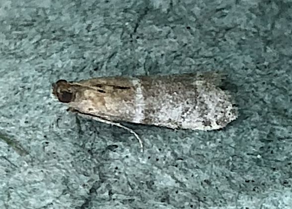 Naturalised through accidental introduction in dried goods in barns, warehouses, granaries and container ports throughout much of the British Isles. In Hampshire and on the Isle of Wight seldom recorded, but then seldom sought, inside flour mills and warehouses. Wingspan 20-25 mm. One of six very similar species of Ephestia found in the UK, which are generally separable only by dissection of the genitalia, most wild-caught individuals being E. unicolorella, with the other five species favouring warehouses. The largest Ephestia species, forewing darker grey than in the other species, discal dots more conspicuous and second line characteristically deeply indented near costa [Goater]. Larva feeds on wheat-flour, dried fruit, nuts, dried goods, cereals and grain, causing sufficient damage to be a serious pest in some areas.