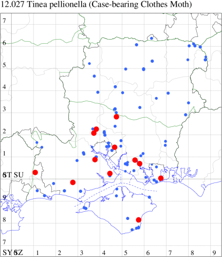 Local in houses, bird nests, barns, warehouses and granaries throughout the British Isles. In Hampshire and on the Isle of Wight sparsely distributed but widespread. Wingspan 9-16 mm. Probably the commonest tineid clothes moth, but cannot always be reliably separated from T. translucens or T. dubiella without dissection of the genitalia. Larva feeds on woollen materials, fur, feathers, hair, owl pellets and stored goods, living within a silken case, causing sufficient damage to be a serious pest in some areas.