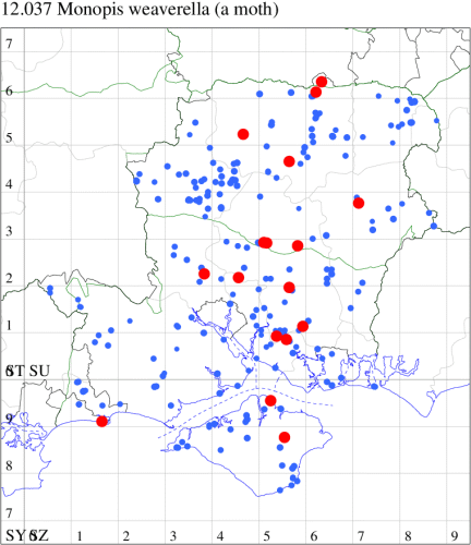 VC11: Blashford Lakes HIWWT NR, one, 29 Jun (PWhtk); Romsey, one, 15 May; one, 29 Jun; one, 01 Sep (NRJ); Allbrook, one, 18 Jul (SIng); Botley, one, 21 Jun (SLB); Southleigh Forest, two, 16 May (CGree det. HMun); Stroud, Petersfield, one, 16 Jun (RAll); Christchurch: Cross Way, two, 17 May (LPyk); Hengistbury Head, one, 30 Jul (MJef); Burton, nr Christchurch, two, 19 Jul (JStw); Sway, one, 29 May; one, 11 Jul (SKee);