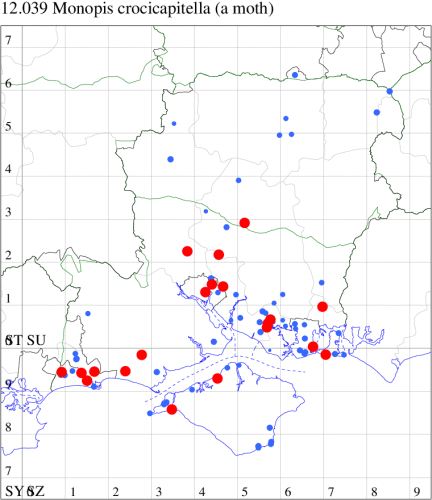 Local in barns, warehouses and granaries throughout much of southern Britain, with records north to southern Scotland. In Hampshire and on the Isle of Wight widespread and reasonably common in the south of the county. Wingspan 10-13 mm. Similar to M. crocicapitella, which see for differences. Larva feeds on woollen materials and refuse, and detritus in bird nests.