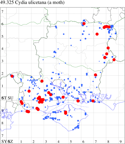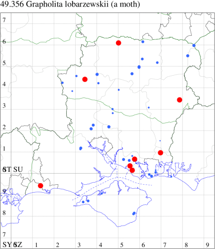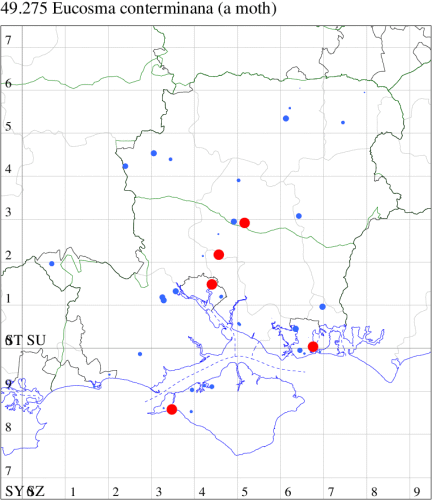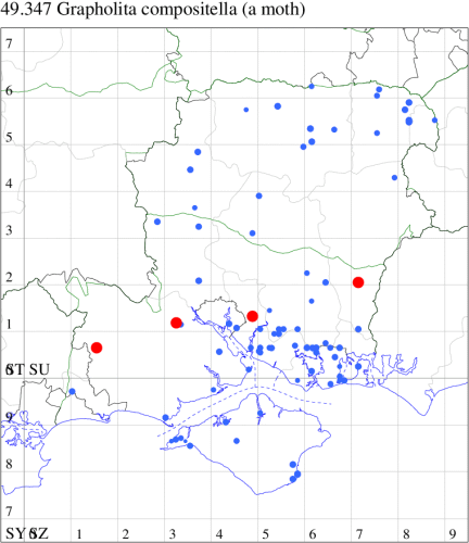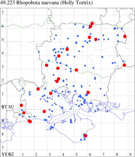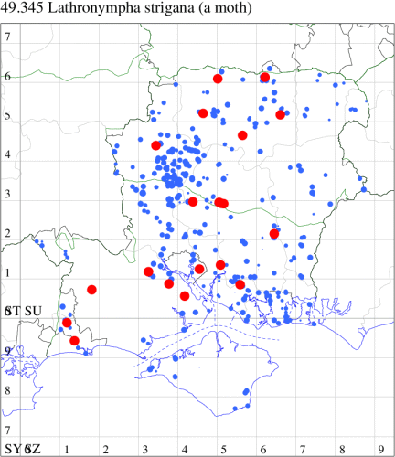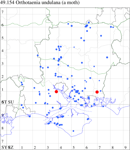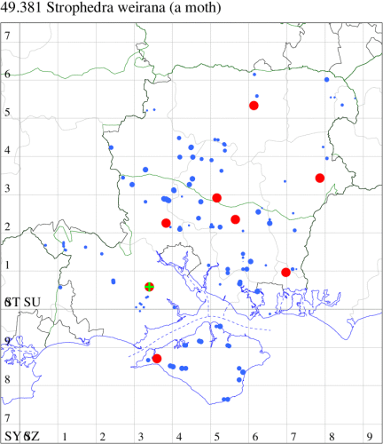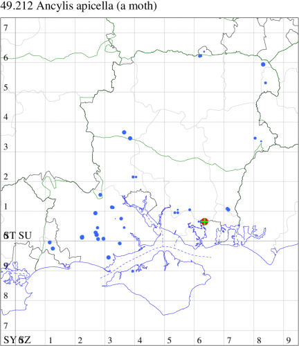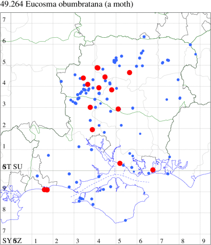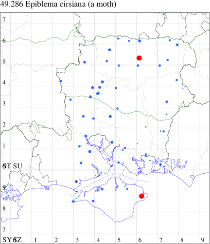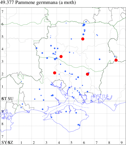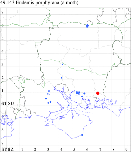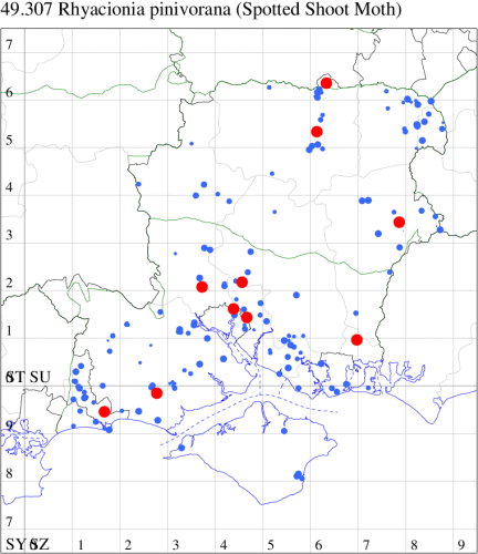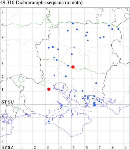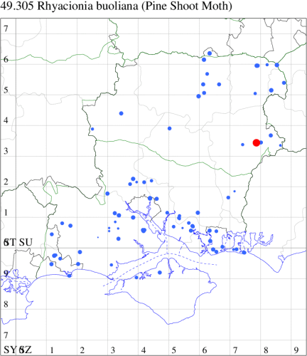 VC11: Howen Bottom, NF, one, 22 Jul (AMD); Pig Bush, NF, one, 24 Jul (NRJ); Woodlands, NF, one, 12 Aug (RBW); Romsey, three, 20 Jul; one, 23 Jul (NRJ); Bevois Valley, Southampton, present, 29 Jul; present, 30 Jul (MCrei); Swaythling, Southampton, one, 30 Jul (MEdg); Southampton, one, 19 Jul; one, 31 Jul (MGP); Itchen Valley CP, one, 19 Jul (CTha); Allbrook, one, 17 Aug (SIng); Botley Wood, one, 05 Aug (AMD); Funtley, one, 01 Aug (TDC); Fareham, one, 24 Jul (IMcP); one, det gen, 01 Sep (MLO det. RJD); Pigeon House Coppice, Boarhunt, one, male det gen, 12 Jul (F.M.G. det. RJD); Portchester, one, 31 Jul; one, 12 Aug (CEH, JGS); Waterlooville, five, 15 Jul; two, 26 Jul; four, 01 Aug; three, 04 Aug; one, 07 Aug; one, 13 Aug; two, 15 Aug; one, 19 Aug; two, 26 Aug (DWhe); Hurn, one, 01 Aug (MJef); Hengistbury Head NNR, one, 01 Aug (HengistH det. RPH); Hengistbury Head, one, 30 Jul; four, 18 Jul; one, 27 Aug (MJef); Sway, one, 31 Jul; one, 28 Aug (SKee);