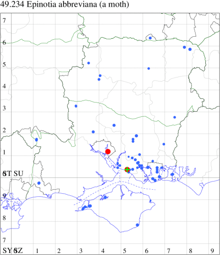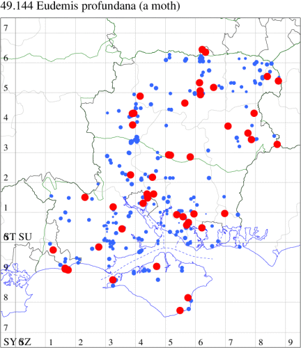 Nationally scarce (Na) in woodland in parts of southern England. In Hampshire very local and primarily associated with semi-ancient woodland, principally Botley Wood and a few sites in the New Forest, and in the north from Pamber Forest. Not recorded from the Isle of Wight to date. Wingspan 17-21 mm. Distinguished from E. profundana by the obsolescent basal fasciae, which are never strongly developed on the dorsum, and the deeply indented whitish dorsal blotch [Bradley]. Larva feeds on Apple, living within a spun or rolled leaf.