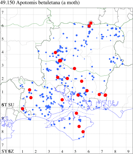 Common in woodland, especially of birch, and heathland throughout the British Isles. Common in Hampshire and on the Isle of Wight wherever there are birch trees. Wingspan 19-23 mm. The forewing pattern and contrasting comparatively clear white ground colour are characteristic [Bradley]. Larva feeds on Silver and Downy Birch, living between leaves spun together with silk.