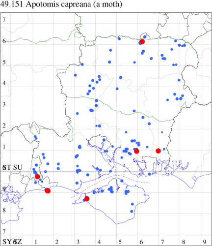 VC11: Woodlands, NF, one, 03 Jun (RBW); Waterlooville, four, to pheromone lure, to ARG lure at 6pm, 23 May; one, 25 May; one, aRG lure, 29 May; two, to pheromone lure, to SKI lure. Gen det, 06 Jun; one, 07 Jun (DWhe); Stanpit Marsh LNR, one, 22 Jun (PAB); Sway, one, conf MJW, 31 May (SKee det. MJW)