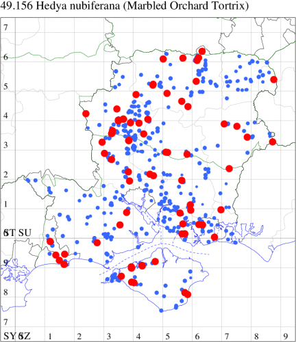Common in hedgerows, gardens and orchards throughout the British Isles. In Hampshire and on the Isle of Wight widespread and common throughout. Wingspan 15-21 mm. Very similar to Plum Tortrix H. pruniana, which differs in having the two black postmedian dots more prominent and situated costad of the projection of the outer edge of the median fascia [Bradley]. Larva feeds on many different deciduous trees and shrubs, including Hawthorn, Blackthorn and Wild Cherry, over-wintering in a cocoon.