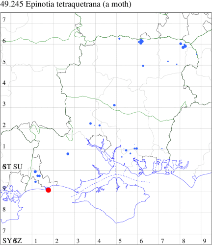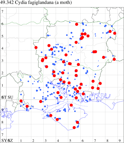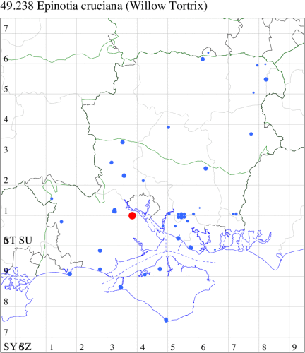 Local in beech woodland across much of southern England. Fairly widely, but sparsely distributed across much of Hampshire and on the Isle of Wight. Wingspan 10-12 mm. The relatively slender and attenuate forewing and the obscure and poorly defined fasciate markings and costal strigulae distinguish this species from S. nitidana [Bradley]; confusion with Pammene germmana is also possible. Larva feeds on Beech, living between leaves spun together with silk, and over-wintering as a pupa.