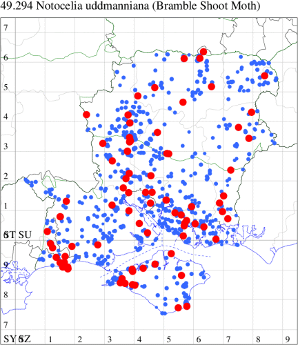 Common in gardens, orchards and hedgerows throughout much of England and Wales, more numerous in the south. In Hampshire widespread and common throughout, but there have been no recent records from the Isle of Wight. Wingspan 16-21 mm. The comparatively lightly marked, ochreous-cream coloration in the distal part of the forewing is characteristic of this species [Bradley]. Larva feeds on Dog-rose, living between shoots spun together with silk.