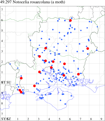 For the maps, all records prior to 2024 are shown by a blue dot (the larger the dot, the more recent), with the current year's records shown in red. As previous records are superimposed on any report for 2024, new sites have greater emphasis (i.e. will show as 'more red').