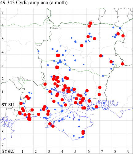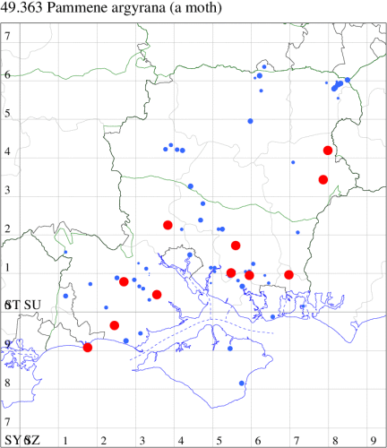 VC11: Linford Bottom, two, 05 Aug (CLew); Frogham, one, 16 Jul (NTO); Romsey, one, 02 Aug (NRJ); Dibden Purlieu, NF, one, 27 Aug (RAC); Allbrook, one, 28 Jul; one, 10 Aug; one, 11 Aug (SIng); Botley Wood, one, 05 Aug (AMD); Dean, Bishop's Waltham, present, 22 Jul; present, 30 Jul (CMor); Waterlooville, one, 04 Jul; one, 01 Aug; one, 07 Aug; three, 13 Aug; one, 15 Aug; two, 17 Aug; two, 24 Aug; three, 26 Aug; three, 27 Aug; three, 29 Aug (DWhe); West Walk, seven, 23 Aug (F.M.G.); Southleigh Forest, three, 22 Aug; five, 04 Jul (CGree det. HMun); Merritown Heath, one, 29 Jun; present, 17 Aug (DFoo);
