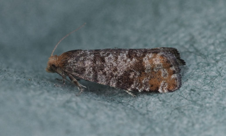 Local in gardens, orchards and hedgerows throughout much of southern England, southern Wales and southern Ireland. In Hampshire and on the Isle of Wight fairly widespread and not uncommon in gardens where there are plum trees, but apparently largely absent from the New Forest, and on the Island confined to the extreme west. Wingspan 10-15 mm. Similar to G. molesta but generally larger; distinguished from G. tenebrosana by the darker, greyish fuscous labial palpi and frons and the whitish irroration in the distal and medio-dorsal areas of the forewing [Bradley]. Larva feeds within fruit of Plum, Blackthorn, Wild Cherry and similar, over-wintering in a cocoon.