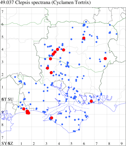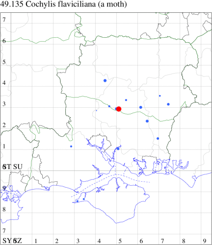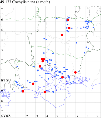 VC11: Earliest: Lee, 09 Apr, 1 (CTha) Latest: Burton, nr Christchurch, 15 Sep, 1 (JStw) Max count: Hengistbury Head NNR, 09 Aug, 5 (BKin)