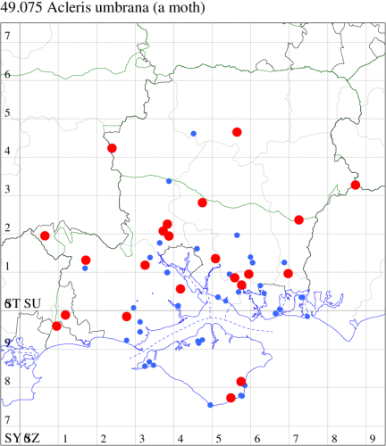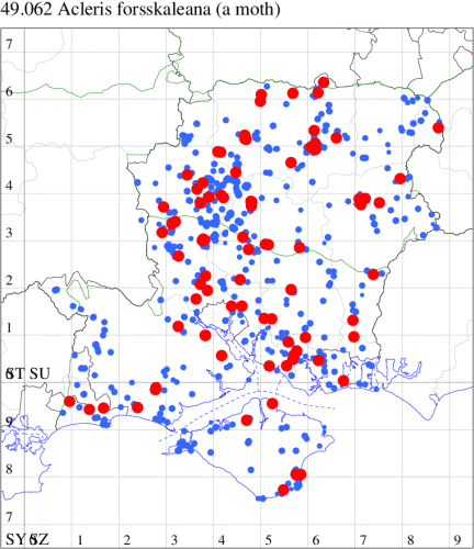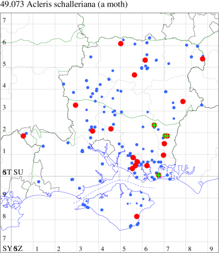 Local in woodland throughout the British Isles, but not in northern Scotland. In Hampshire and on the Isle of Wight found in mature woodland and widely distributed in such habitat. Wingspan male 19-25 mm, female 24-30 mm. The large size and distinctive olive-brown markings are characteristic of this species [Bradley]. Larva feeds on various deciduous trees and shrubs, living within a spun or rolled leaf.