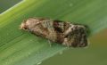 Common in woodland and orchards throughout much of the British Isles. In Hampshire and on the Isle of Wight widespread and fairly common in woodland throughout the county, but less common on the Island. Wingspan 16-22 mm. Distinguished by the generally dark coloration of the fore- and hindwings, the shining metallic edging of the median fascia and the metallic scaling in the apical area of the forewing [Bradley]. Larva feeds on deciduous trees and shrubs, living within a spun or rolled leaf, over-wintering in a cocoon.
