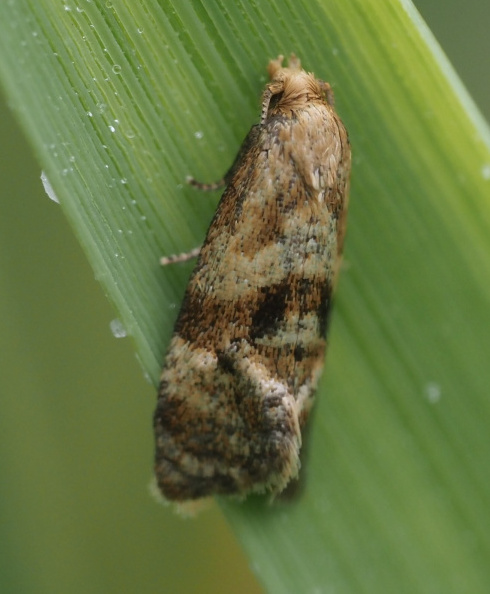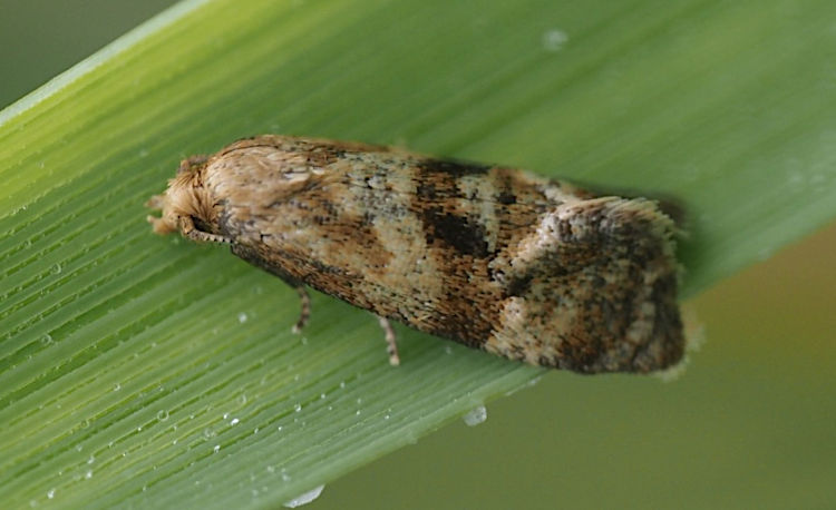 Local on waste ground, in woodland edges and hedgerows throughout much of England and Wales. In Hampshire infrequently recorded and nowhere common, but has been recorded several times from Southsea; first recorded from the Isle of Wight in 2015. Wingspan 14-17 mm. Distinguished from A. francillana by the broader and less oblique median and postmedian fasciae of the forewing [Bradley]. Larva feeds within stems of Hemlock.