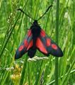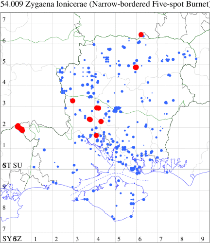 Local on grassland and heathland, and by freshwater margins, throughout much of southern England and Wales. In Hampshire not as widespread as in the past, but still locally present, generally on the chalk, and relatively frequent on the Isle of Wight. Wingspan 24-37 mm. Day-flying. Very difficult to distinguish from the much more widespread Narrow-bordered Five-spot Burnet Z. lonicerae, even using features of genitalia: however, the habitat, time of year and location may help; slightly smaller than Narrow-bordered; examples with the middle pair of spots merged are frequent in Five-spot Burnet, but rare in Narrow-bordered (MBGBI Vol 2). It is very difficult to make a determination based on one individual from photos. Larva feeds on Greater Bird's-foot Trefoil.